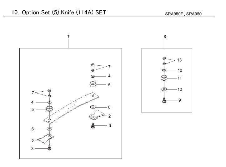 OPTION SET (5) KNIFE (114A) SET assembly details for Iseki SRA950F-950 RIDE ON BRUSHCUTTER SRA 800 - 950F model