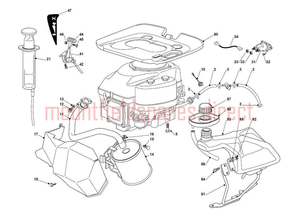 ENGINE (GGP) FUEL TANK THROTTLE CABLE MUFFLER assembly details for Mountfield Series 7250 OHV-414cc 2013 model