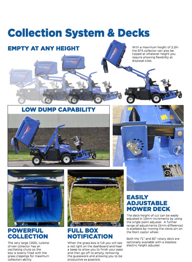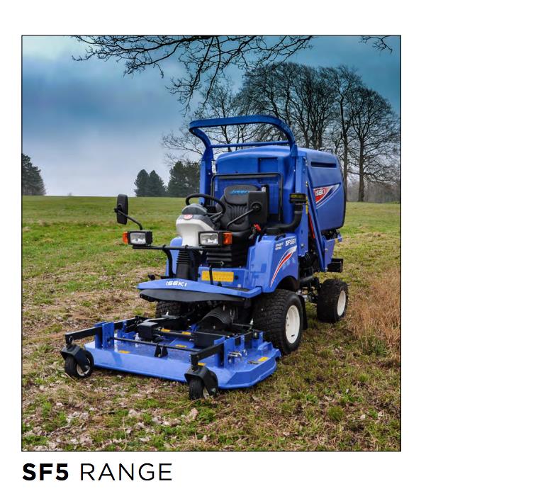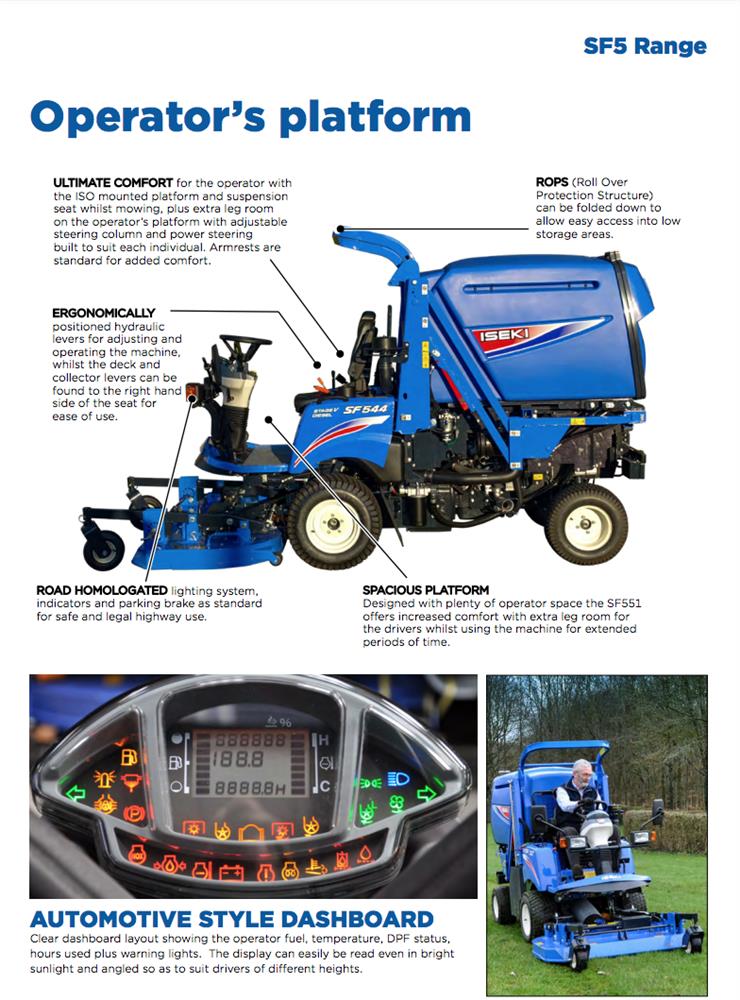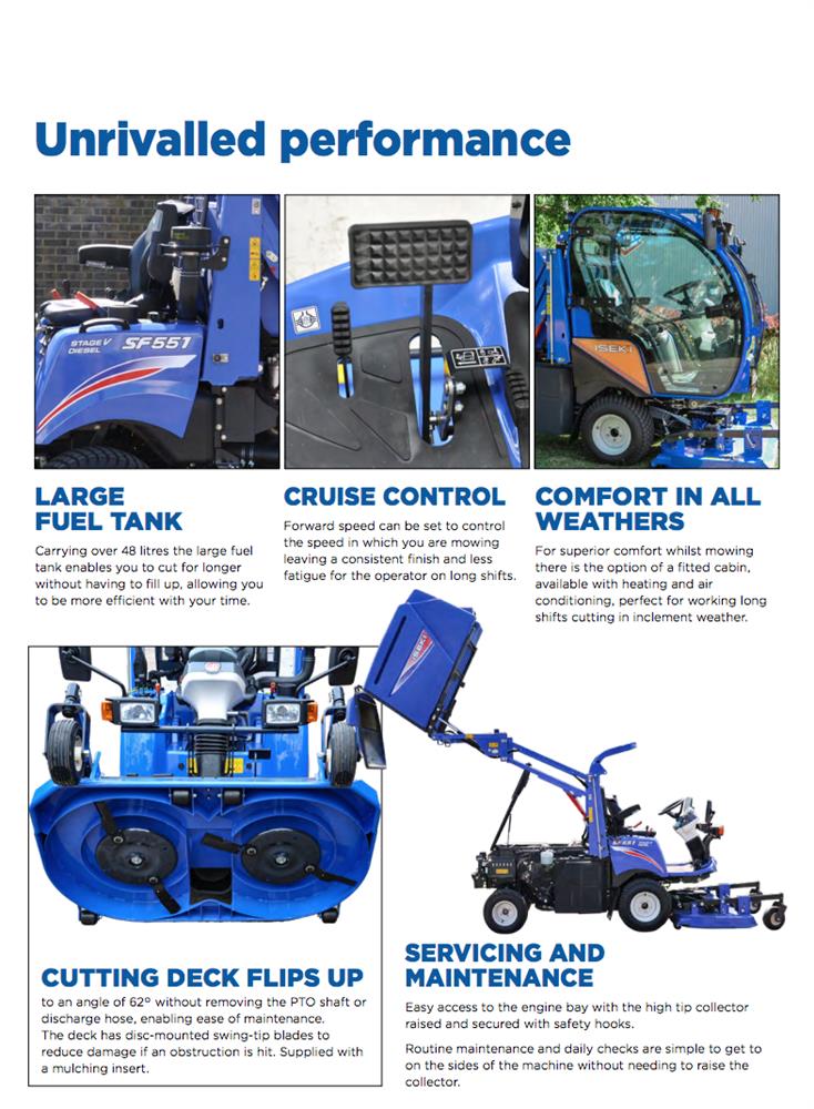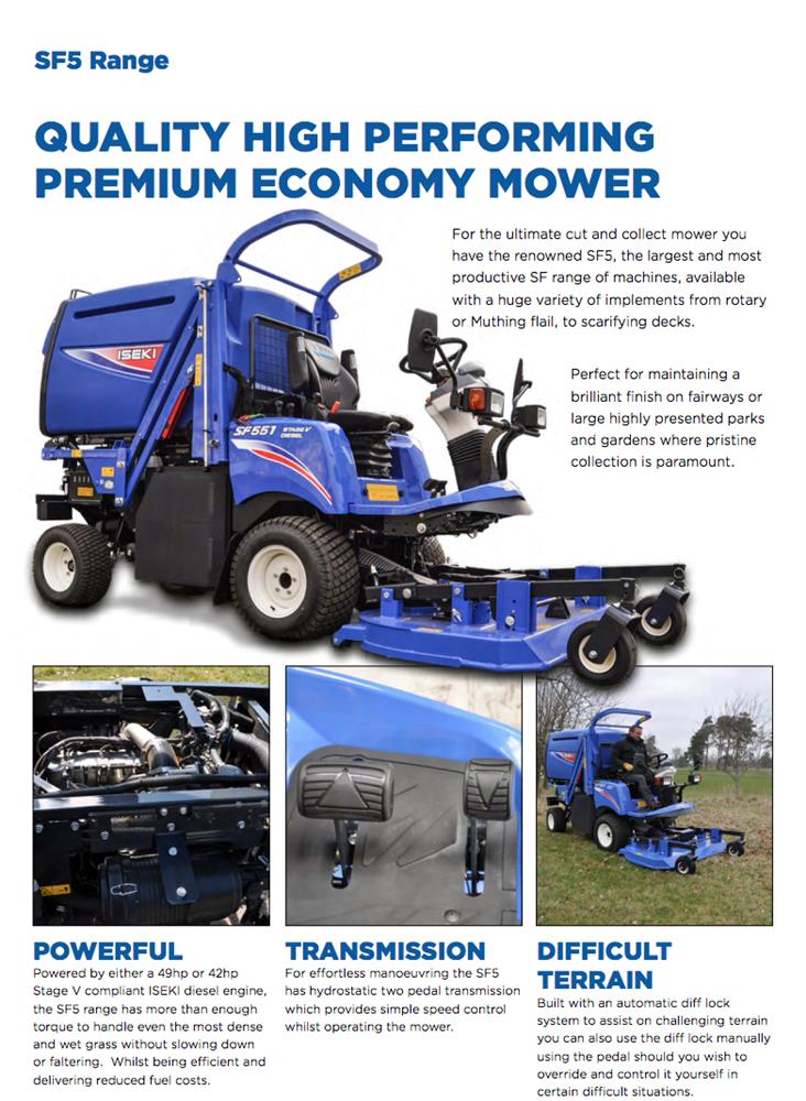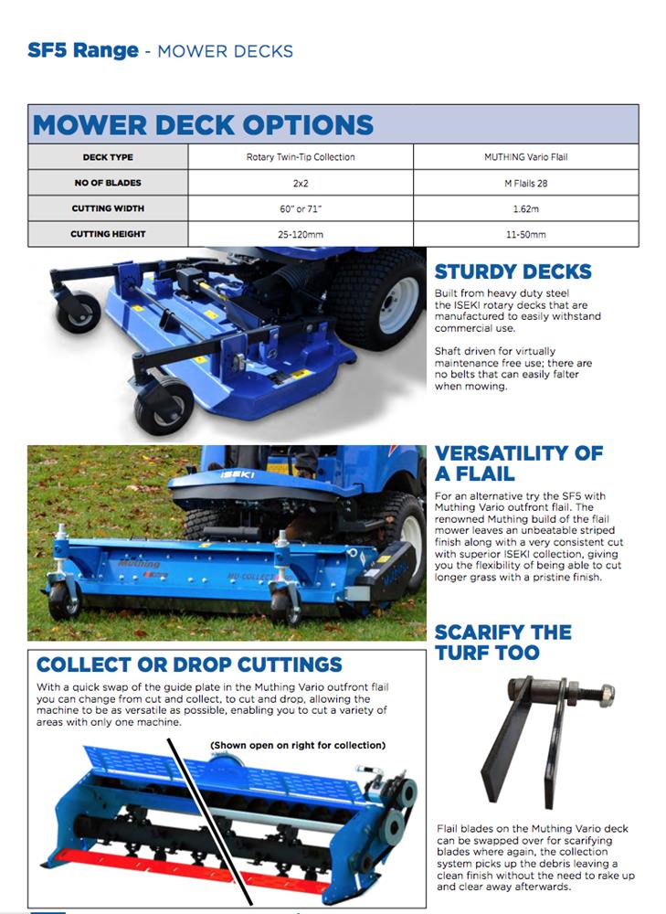 MODEL SF544 SF551 POWER Engine Type ISEKI E3FH ISEKI E4FH Displacement 1.826ltr 2.434ltr No of cylinders 3 4 Power 42hp 49hp Fuel Capacity 48ltr 48ltr Regulation Stage V Stage V TRANSMISSION Type HST Front Axle Standard Steering system Power Steering with adjustable height & tilt 35degrees Driving system 4WD PTO Mower Clutch type: Wet Multiple Disk Revolution 2,400@2,000min-1 (rpm) Blower Clutch type: Wet Multiple Disk Blower revolution 2,400@3,000 min-1 (rpm) BRAKES Type Dry Drum Parking Brake Lever Differential Lock Type Standard Max Travelling Speed 20km/h fwd 15km/h rev 22km/h fwd 16km/h rev TYRES Turf Front 24 x 12.00 - 12 Rear 20 x x10.00 - 10 MOWER DECK SMCA 71 Rotary SMCA 60 Rotary Muthing Vario Flail No of Blades 2 x2 2 x2 M-Shackle Flails 28 Discharge Rear Collection Rear Collection Rear Collection or Drop Cutting Width 71” 60” 1.62m Cutting Height 25-120mm 20-120mm 11 - 50mm Adjustments 2 & 10 stages by pin replacement, 5mm increments 2 & 10 stages by pin replacement, 5mm increments Adjustable by rear roller and front castor wheels Weight 305kg (electric deck 330kg) 230kg (electric deck 255kg) 244kg Linkage 20kg Electric Height of Cut Optional Optional N/A