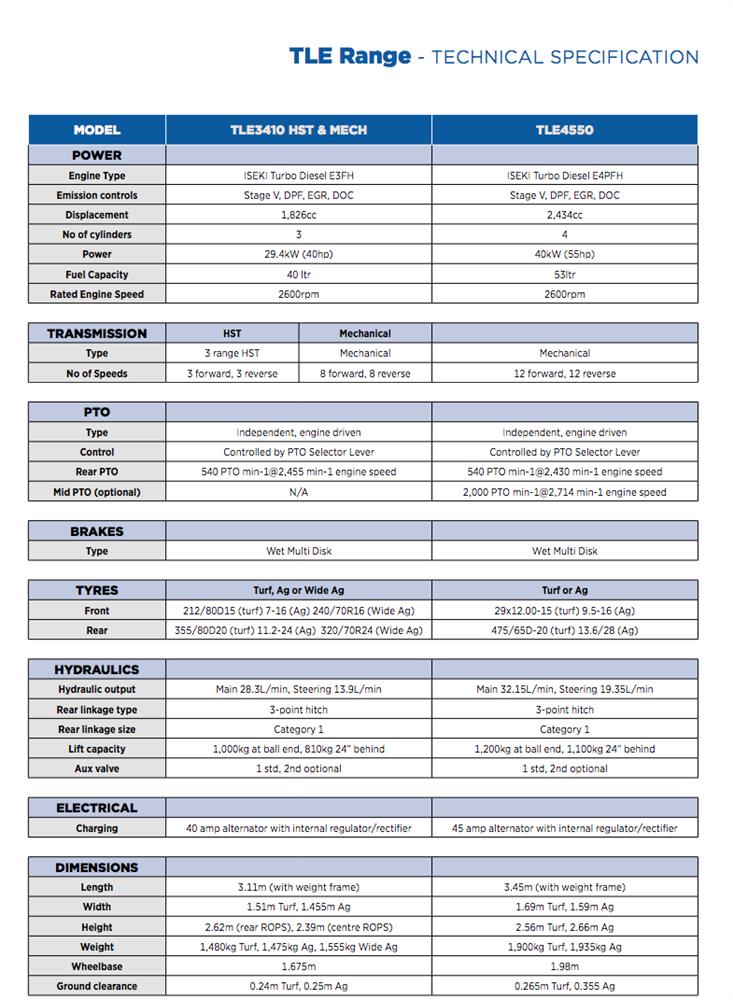 - Available with F12/R12 mechanical transmission on the TLE4550 or a choice of 3-speed HST and F8/R8 mechanical transmission on the TLE3410