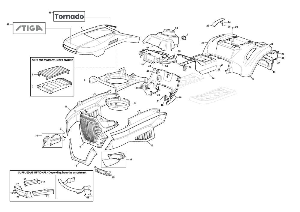 BODYWORK assembly details for Stiga TORNADO 398 (2T0610481/ST1) 2022 model
